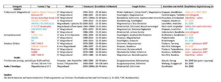 Die Abbildung zeigt einen Detailüberblick über die Haltbarkeit von Videobändern und Schmalspurfilme:
